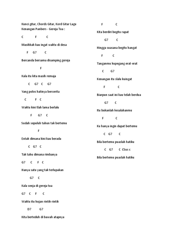 F g c e am c g c c f c masihkah kau in. Kunci gitar gereja tua panbers chord gereja tua panbers g c g masihkah kau ingat waktu di desa. Chord lagu gereja tua kumpulan ilmu dan pengetahuan penting. intro c majorc ff g+g c majorc a minoram c majorc g+g c majorc ff c g+g c majorc kala senja di gereja tua. intro c f g c am c g c f c f c f c masihkah kau ingat waktu di desa f g c bercanda bersama di samping gereja c f kala itu kita masih remaja c g c g yang polos hatinya bercerita c f c waktu.